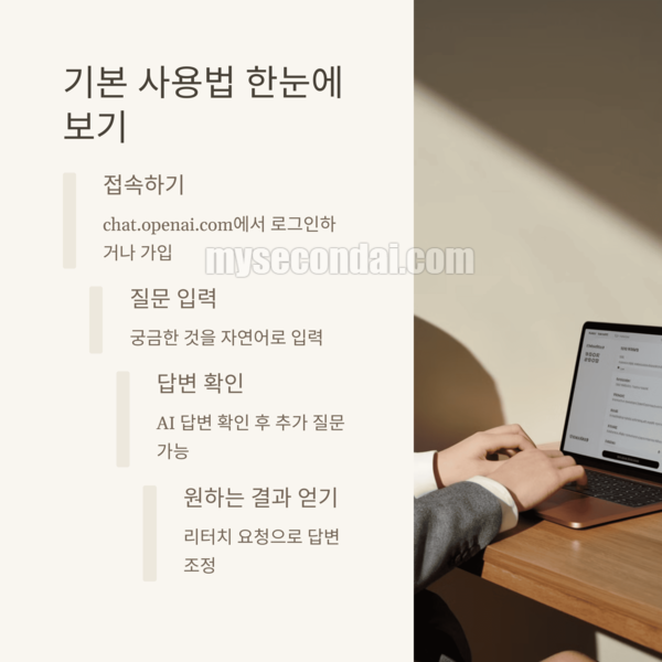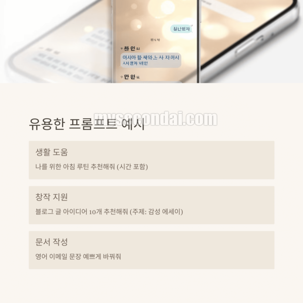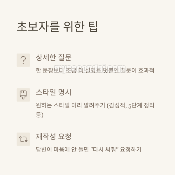 | 4. 원하는 결과 얻기 | "다시 써줘", "조금 더 짧게", "리스트로 정리해줘" 등 리터치 가능 |