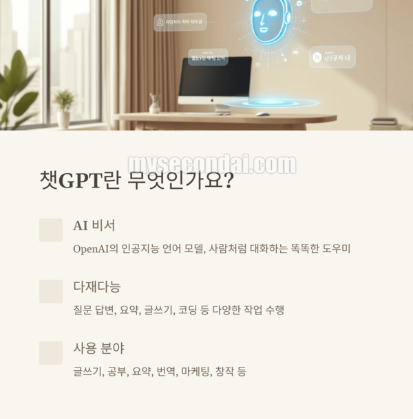 챗GPT는 OpenAI에서 개발한 인공지능 언어 모델이에요. 쉽게 말해, 사람처럼 자연스럽게 대화하고 글을 쓰는 AI 비서라고 보시면 됩니다. 질문을 하면 대답해주고, 요약도 해주고, 글도 써주고, 코드도 짜주는 정말 똑똑한 도우미죠.