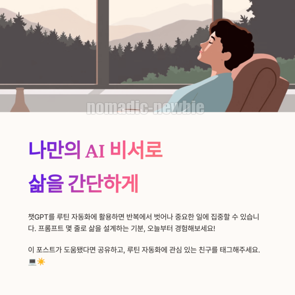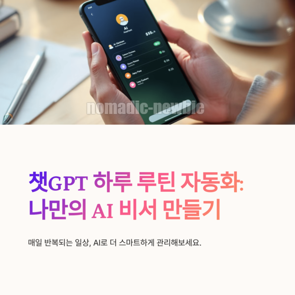 하루 24시간, 우리는 무수히 많은 결정과 반복 속에 살고 있죠. 하지만 챗GPT를 루틴 자동화에 활용하면, 그 반복에서 벗어나 더 중요한 일에 집중할 수 있습니다. 저는 아침마다 같은 질문을 GPT에게 던지는 습관을 만들었고, 그 습관이 삶을 훨씬 간단하게 만들어줬어요. 프롬프트 몇 줄로 내 삶을 설계하는 기분, 한 번 꼭 경험해보시길 추천드립니다. 오늘부터 나만의 루틴 비서를 만들어보세요. 💻☀️