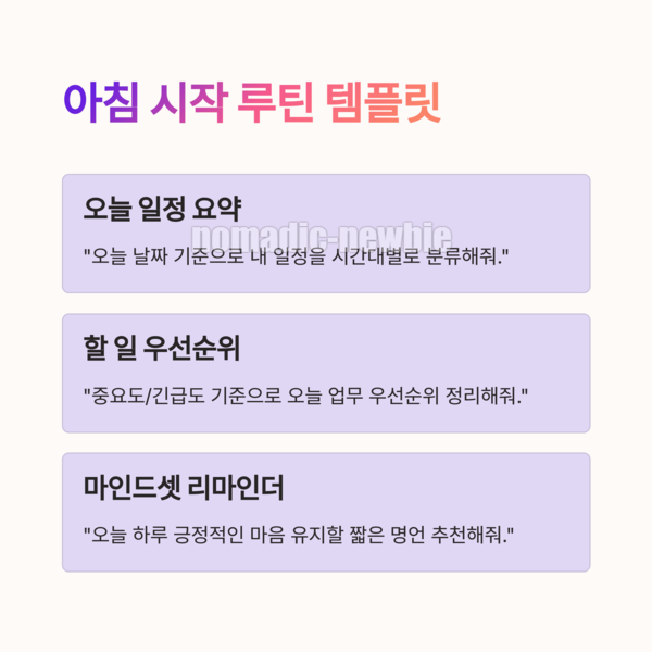 | 할 일 우선순위 정리 | “중요도/긴급도 기준으로 오늘의 업무 우선순위를 정리해줘.” |