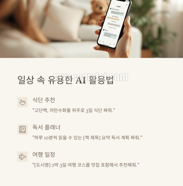 챗GPT는 업무뿐만 아니라 일상생활에서도 아주 유용하게 활용할 수 있어요. 아래 예시처럼 활용하면, 시간을 아끼고 더 나은 선택을 할 수 있습니다.