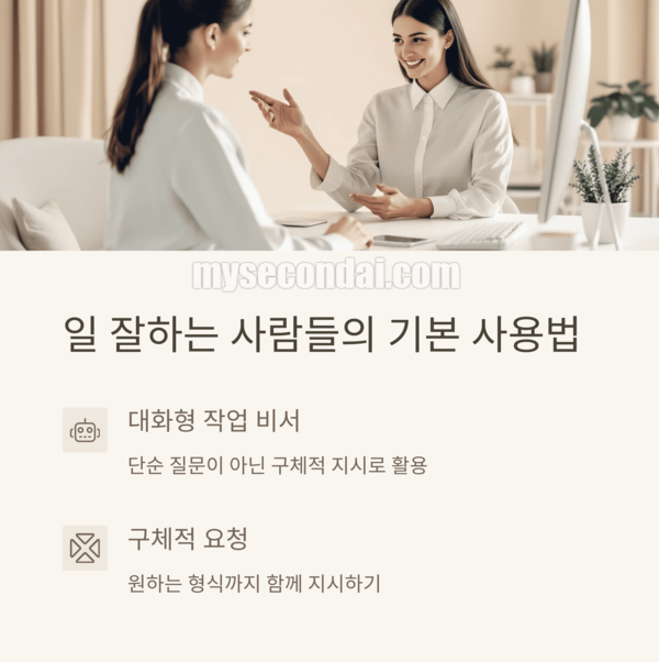 생산성 높이는 사람들은 챗GPT를 단순한 질문 도구가 아니라 ‘대화형 작업 비서’로 활용합니다. 예를 들어, “이 자료 요약해줘”가 아니라, “A4 한 장 분량으로 요약하고, 주요 키워드 5개도 뽑아줘”라고 요청하는 식이죠.