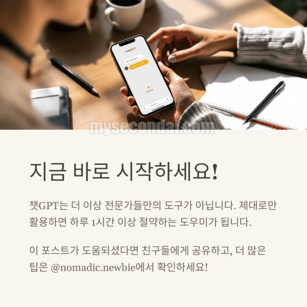 챗GPT는 더 이상 전문가들만의 도구가 아닙니다. 누구나 일상과 업무에 쉽게 접목시킬 수 있고, 제대로만 활용하면 하루 1시간 이상 절약하는 도우미가 되어줍니다. 챗GPT 활용 예시 모음, AI 초보도 금방 익히는 실천 가이드를 통해 지금 당장 시작해보세요. 당신의 하루는 더 효율적으로, 더 창의적으로 바뀔 수 있습니다. 궁금한 점이 있다면 MySecondAI.com 또는 @nomadic.newbie에서 함께 성장해보세요!