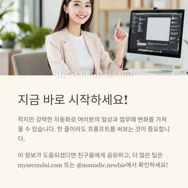 지금까지 챗GPT의 실무 활용 예시부터 고급 프롬프트 작성법까지 함께 살펴보았습니다. 챗GPT 활용 예시, 전문가가 알려주는 실무 적용 팁이 여러분의 일과 일상에 ‘작지만 강력한 자동화’로 연결되길 바랍니다. 가장 중요한 건 지금 바로 한 줄이라도 프롬프트를 써보는 겁니다. 익숙해질수록 여러분만의 GPT 루틴이 생기고, 그게 결국 경쟁력이 됩니다. 궁금한 점이 있다면 언제든 mysecondai.com 또는 @nomadic.newbie에서 함께 성장해보세요!
