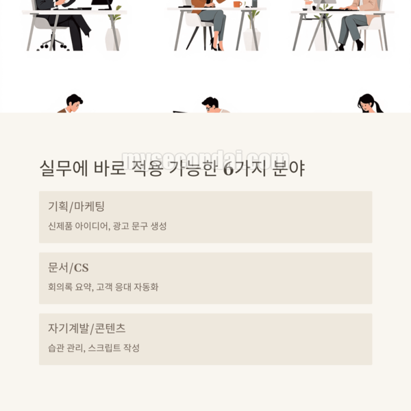 많은 분들이 “어떤 분야에 쓸 수 있죠?”라고 묻는데, 답은 “거의 모든 업무입니다.” 특히 아래 6가지 분야는 GPT의 효율이 극대화되는 대표적인 실무 영역이에요.