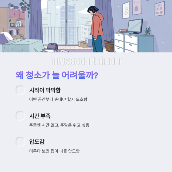청소가 어려운 이유는 단순히 '귀찮아서'가 아닙니다. 어떤 공간부터 손대야 할지 모호하고, 정해진 순서 없이 하다 보면 시작부터 막막해지죠. 특히 바쁜 직장인은 주중엔 시간 없고, 주말은 쉬고 싶은데 청소하자니 스트레스만 쌓입니다. 결국 미루고 또 미루다 보면, 어느새 집이 나를 압도해 버립니다.