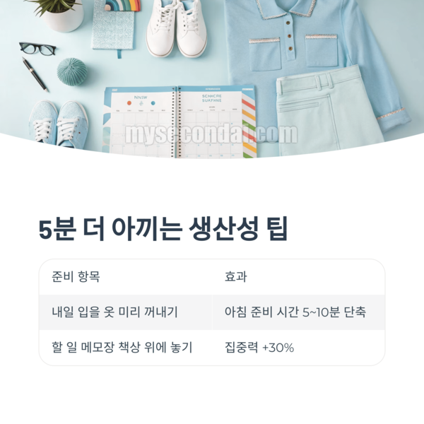 | 내일 입을 옷 미리 꺼내기 | 아침 준비 시간 5~10분 단축 |