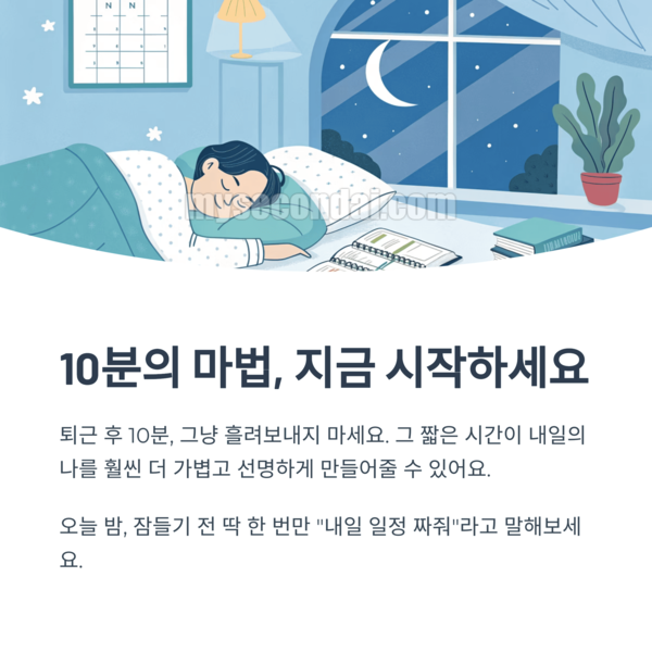 하루의 피로가 밀려오는 저녁, 대부분은 ‘오늘 하루도 고생했다’며 그냥 쉬고 싶어지죠. 그런데요, 이때 단 10분만 투자해보세요. 다음 날 아침의 혼란스러움이 사라지고, 일에 대한 주도권을 되찾게 됩니다. 심지어 마음이 더 가벼워져요. ‘퇴근 후 10분’이 마법처럼 느껴지는 이유랍니다.