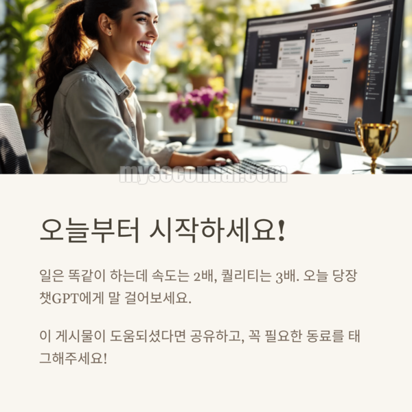 챗GPT, 아직도 남의 이야기라고 느껴지시나요? 사실 회사에서 챗GPT를 제대로 쓰는 사람과 아닌 사람의 차이는, 마치 수동차와 자동차만큼이나 큽니다. 일은 똑같이 하는데 속도는 2배, 퀄리티는 3배. 이제는 '일 잘하는 사람'의 기준이 달라졌어요. 중요한 건 시작입니다. 오늘 당장 "내가 쓰는 보고서 개요 좀 짜줘"라고 챗GPT에게 말 걸어보세요. 아마도 내일부터 회사에서 “오~ 일머리 있네?”라는 말, 들으실 수 있을 겁니다 :)