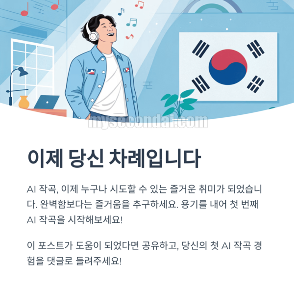 AI 작곡, 어렵게만 느껴졌던 '나만의 노래 만들기'가 이제 누구나 시도해 볼 수 있는 즐거운 취미가 되었습니다. 처음부터 완벽한 곡을 만들려 하지 마세요. 그저 즐기세요! AI가 당신의 음악적 여정에 든든한 조력자가 되어줄 겁니다. 아낀 시간으로 더 소중한 것을 즐기세요. 이젠 당신 차례입니다. 용기를 내어 당신의 첫 번째 AI 작곡을 시작해 보세요!