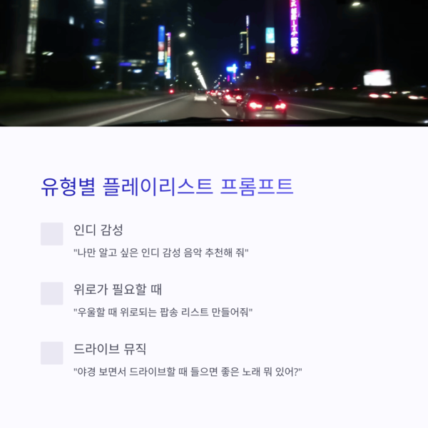 | 장르+상황 조합 | "로파이 힙합 스타일로 공부 집중할 수 있는 음악 리스트 만들어줘" |