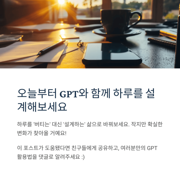 챗GPT와 함께하는 하루 일정 관리는 단순한 스케줄링을 넘어서 나 자신을 더 잘 이해하는 도구가 될 수 있어요. 저는 하루를 그냥 '버티는' 대신 '설계하는' 느낌으로 살아가고 있어요. 똑똑한 하루가 모이면 결국 똑똑한 삶이 되니까요. 오늘부터 여러분도 GPT에게 하루의 동반자가 되어달라고 말해보세요. 작지만 확실한 변화가 찾아올 거예요 :) 궁금한 점이나 공유하고 싶은 루틴이 있다면 댓글로 함께 나눠요!