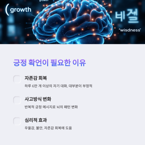 긍정 확언은 단순한 멘트 이상입니다. 반복적으로 뇌에 긍정적인 메시지를 입력해 우리의 사고방식을 조금씩 바꾸죠. 실제로 심리 치료나 명상, 자기계발 코칭에서도