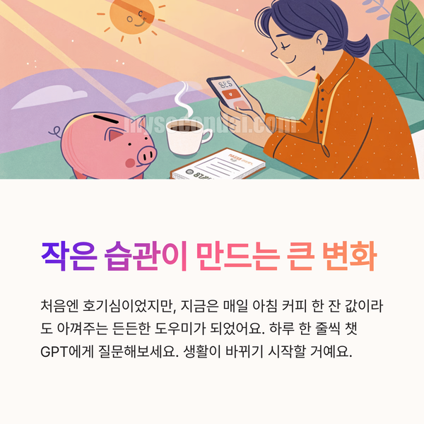 살면서 '작은 습관 하나가 이렇게 큰 차이를 만들 수 있을까?' 싶은 순간이 있죠. 저에게 챗GPT가 그랬습니다. 처음엔 호기심이었지만, 지금은 매일 아침 커피 한 잔 값이라도 아껴주는 든든한 도우미가 되었어요. 돈이 많고 적음의 문제가 아니라, 그걸 어떻게 아끼고 지혜롭게 쓰느냐의 문제라는 걸 이제야 깨달았달까요. 여러분도 오늘부터, 하루 한 줄씩 챗GPT에게 질문해보세요. 생활이 바뀌기 시작할 거예요.